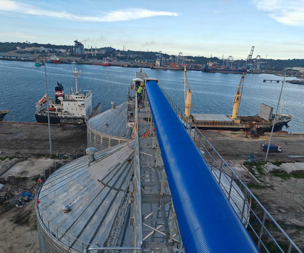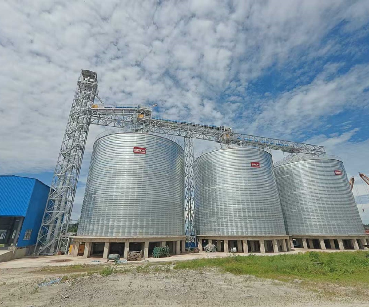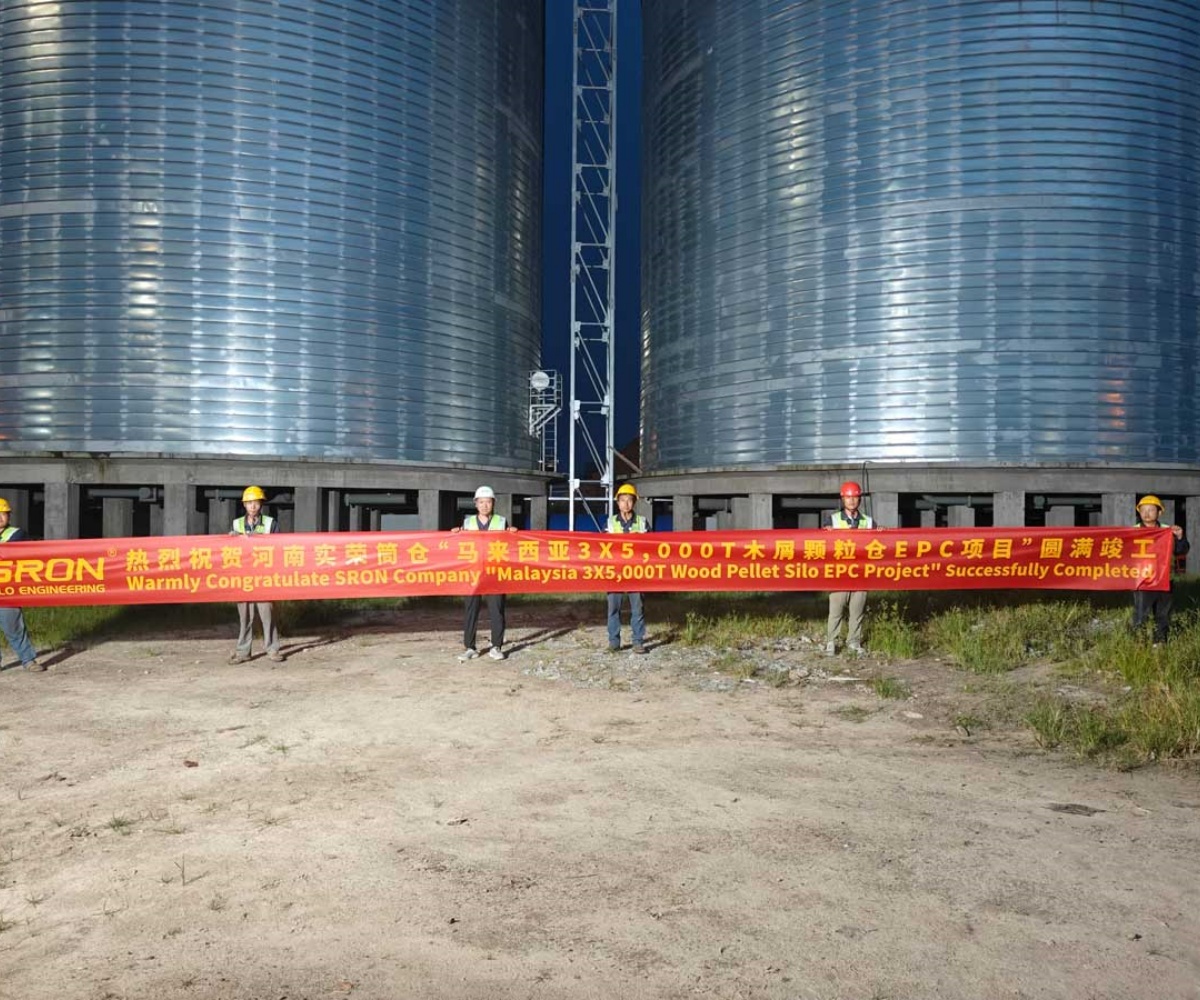 In Southeast Asia, a core biomass energy production region, SRON’s successfully delivered 3x5000T wood pellet storage project in Malaysia has become a benchmark project in the area. The project primarily served a large renewable energy company, for which SRON designed and constructed three 5000-ton spiral steel silos. Addressing Malaysia’s hot and humid tropical rainforest climate and the harsh environment of the project site, which is frequently threatened by typhoons, the SRON team provided customized solutions. The project included spiral steel silos, unloading pits, weighbridges, conveying systems, and long-distance conveying systems outside the silos. Our company fully considered the storage characteristics of wood pellets and the local environment during the early design phase, and strictly monitored and managed the temperature and humidity within the silos in real time. Meanwhile, considering the characteristics of the terminal project, the project is equipped with a high-throughput silo loading and unloading system, which shortens the ship berthing time and solves problems such as blockage, maintenance difficulties and high labor costs that may occur during centralized feeding, dust removal and long-distance transportation, thus meeting the customer’s demand for fully automated warehousing and transportation.